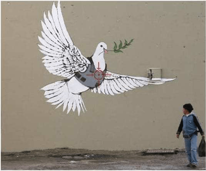 This piece is featured on the concrete part of the West Bank Wall (used to separate Palestine and Israeli). Through this piece’s contrasting and ironic symbolism, it is able to represent how peace can only be maintained and achieved if people want it; and in this case he believes people don’t.